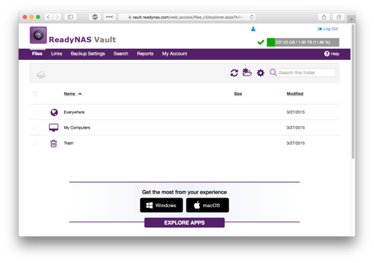 ReadyNAS Vault is a customized implementation of the ElephantDrive cloud backup, sync, and sharing platform. Developed in collaboration with NETGEAR to integrate seamlessly with the ReadyNAS management experience, the ReadyNAS Vault is tightly coupled with the devices to ensure simple activation, on-boarding, and management for users seeking a professionally managed separate-site backup protection for their valuable data.